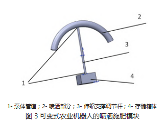 可变式农业机器人的喷洒施肥模块(图3),该模块主要用于将农药、水、肥料等液体喷洒到目标物上,主要有泵体管道、喷洒部分、伸缩支撑调节杆、存储箱体组成。泵体管道用于传输,喷洒部分整体结构成扇形,可以最大限度接触农作物,伸缩支撑杆主要用于支撑和调节高度,存储箱体内部设有液体动态检测装置,可以检测内部液体总量情况,其主要用于储存喷洒物品。当产品进入工作区域后,对于当前的农作物产品和种植情况进行拍照识别,将信息传递给前端中枢系统,通过数据处理,判断农作物生长、病虫害等情况,精准调节喷洒剂量并且进行喷洒,该模块满足不同场景下对于喷洒的需求使用[6-7],例如喷洒农药、喷洒水、喷洒液态化肥等。