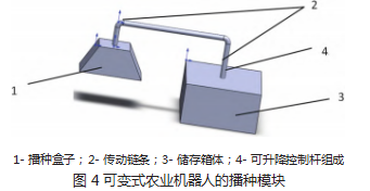 可变式农业机器人的播种模块(图4),该模块主要用于种子类农作物播种,主要是由播种盒子、传动链条、存储箱体、可升降控制杆组成。播种盒子包括开沟铲和覆土轮组成,开沟铲用来铲种子土坑,覆土轮在播种完成后,覆盖土坑并轻度压实,确保种子与土壤紧密接触,传动链条可将箱子中的种子运到播种盒子,储存箱体内部有一个动态监控器可检测内部剩余量,主要是用来储存种子,可升降控制杆是整体高度的调节装置。当机器人收到播种命令后,前端中枢可对种子、种植区域进行识别,然后进行计算,调整合适的播种数量、播种间距以及深度,精准的将存储箱体中的种子通过传动链条进入播种盒子中进行播种,该模块适用范围较广,可播种不同农作物种类的种子。