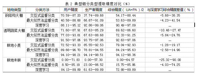 耕地种植属性的精细化管理对细分类型提取精度提出更高要求。不同分类方法在关键细分类型上的用户精度与生产者精度差异直接决定技术方法的实践价值。选取设施耕地(钢结构大棚、透明蔬菜大棚)、作物种植区(耕地小麦)及特殊耕作状态(耕地未耕)四类核心细分类型,构建多维度精度对比体系,结果如表2所示。