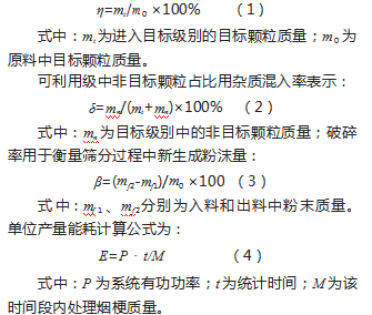 为定量评价分级效果,采用筛分效率η、杂质混入率δ、破碎率β和单位产量能耗E等指标。筛分效率定义为: