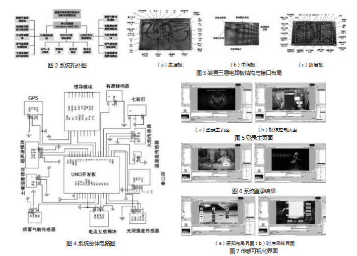采用三层叠板结构,底层板集成设备定位、土壤含水率检测及串口显示等模块,实现采集与控制状态的本地可视化(图3)。中间板作为电源与通信枢纽,为上下层提供电源并统一汇聚数据通道。顶层板实现环境感知与告警,集成温度、湿度、空气质量与光照强度等传感单元,并与告警系统联动输出状态提示。各器件按功能分区焊接,板层间通过6P/8P线束与主控引脚对接。