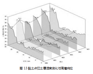 秋分正午在海南省海口市NE1-NE6六个测试点开展强通风条件下的土壤含水量观测。换气率保持ACH=1000,以减弱室内温湿波动对地表蒸散的影响。试验对象为黏土种植区,总采样时长30min,前22 min维持自然蒸散与稳定通风,28—30min向土壤表层缓慢滴水并保持恒定滴速。测试结果如图13所示。