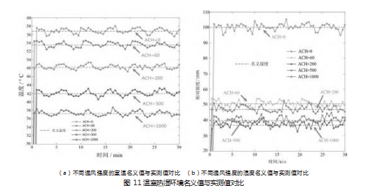 以NE3测试点进行试验装置的空气温度传感测试,在ACH分别为0、60、200、500、1000的五种工况下,每种工况连续采样30分钟,对每一种工况的测试温度值与计算的名义温度值进行比较。