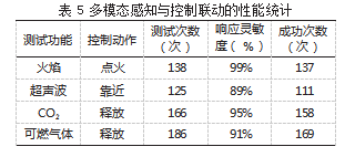 为验证多模态感知与控制联动系统的闭环性能,在阈值设置及动作判据的基础上,对火焰点火、超声靠近、二氧化碳和可燃气体四类通道开展重复触发试验。分别独立计次,由系统日志与人工复核双重确认,试验结果见表5。