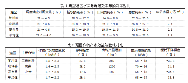 水资源调度效率与损耗率是衡量智慧水务体系成效的关键指标。智慧水务系统建成后,市级调度中心基于黑河来水实时数据动态优化供水计划,响应时间由2018年的22小时缩短至4小时以内;县级管控站利用变频恒压设备实现精准供水,田间终端依据作物需水阈值自动启停灌溉设备,实现快速响应与精准控制。按照张掖市380万亩灌溉面积计算,年节水约7.2亿m3,占黑河年均径流量的12.3%。输水与田间损耗显著下降,2023年三大灌区平均输水损耗率降至18.5%,较2018年下降17.7%,得益于防渗渠改造与智能闸控调度协同作用。甘州区通过斗渠硬化及智能阀门改造,输水损耗率从38.5%降至17.2%,降幅最大,田间损耗率由21.8%降至9.5%,主要归功于精准墒情监测与水肥一体化灌溉。2023年三大灌区平均总损耗率为28.0%,较2018年下降30%,其中甘州区玉米制种灌区总损耗率仅25.0%,达到优秀水平。典型灌区水资源调度效率与损耗率具体数据如表1所示。