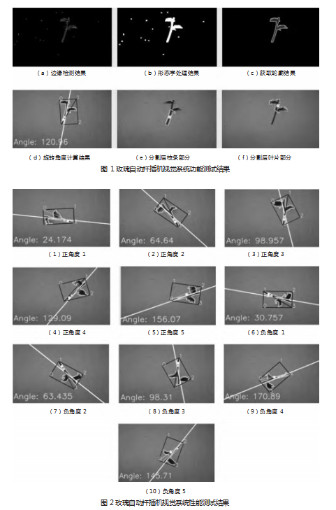 对玫瑰自动扦插机视觉系统的软硬件功能进行了测试。系统软件工作流程如下:(1)连接海康威视摄像头,并设置相机参数和帧率,并读取摄像头的图像,图像大小设置为640×480;(2)对采集到图像进行高斯滤波,使用高通滤波法进行锐化处理,然后使用加权平均法将彩色图像转化为灰度图像;(3)使用Canny算子对灰度图像进行边缘检测,对图像中的物体进行分割;(4)经过形态学处理结果提取最优轮廓特征,并使用掩膜图像获取最优插穗的枝条图像;(5)插穗旋转角度为0—180°,枝条部分在下、叶片在上时定义为正角度,反之为负角度,绘制最优插穗的最小外接矩形,获取其旋转角度和正负方向;(6)分割最优插穗,获取枝条部分,根据重心法确定机械爪的抓取点坐标。