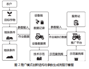 推广模式创新重点集中在作业数据驱动、机具配置智能化与服务端口前移三个方向。数据驱动层面,凭借在机具上集成北斗终端、油耗计量模块与压力传感器,形成可持续采集的“作业数据包”,平台依据作业深度偏差、喷幅覆盖率与轨迹密度自动生成技术示范片段,用于线上推送与线下演示。机具配置智能化方面,依托机型数据库构建“参数反推”模型,根据农户提交的目标作物与地块条件,自动匹配合适的作业幅宽、喷幅压力区间与导航路径间距,并生成可直接导入控制终端的参数文件,提高推广的落地性。服务端口前移环节中,村级服务站配置便携式喷幅检测仪、割台高度标定板与导航基站微终端,使示范培训可在田间完成,减少农户跨区域学习成本。构建跨村共用的作业案例库,通过参数回放功能展示在不同地块条件下的速度—负荷响应规律,强化推广的可理解性与可复现性。为展示数据驱动型推广模式的核心结构及参数生成的执行链路,构建了图2。