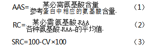 参考原远等[6]的氨基酸比值系数法评估蛋白质营养价值;利用食品法典委员会(FAO/WHO)的必需氨基酸模式及WHO/FAO/UNU(2007年)评分模式,分别计算样品中必需氨基酸比值(AAS)、氨基酸比值系数(RC)和比值系数分(SRC)[7]。计算公式如下。