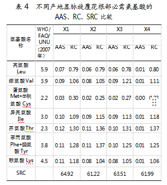 依据WHO/FAO/UNU(2007年)评分模式,分别计算4个处理AAS、RC、SRC,结果如表4所示。数据表明,4个处理的AAS和RC均表现出相同趋势:Thr、Phe+Tyr比值高,而Met+Cys比值低,再次说明显脉旋覆花根部氨基酸中第一限制氨基酸是Met+Cys。SRC直观反映了蛋白质的营养价值。其数值越接近100,说明蛋白质营养价值越高[10]。4个处理的SRC值在61~65,排名为:X1>X3>X4>X2,最大差值为3.7,说明X1蛋白质的营养价值较其他处理更高。但4个处理的SRC分值均低于65,低于大米(70.5)和小麦(72.47)[11],说明显脉旋覆花根部的蛋白质非优质蛋白。
