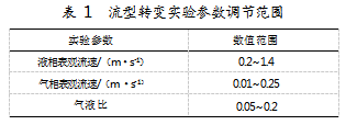 实验设计先调节管内气液比,设置3个气液比工况:0.05(工况1)、0.1(工况2)、0.2(工况3),再调节控气阀和控水阀调节气、液两相表观流速(见表1),通过分析摄像机拍摄的流质照片,确定气液混合流质流型分布。