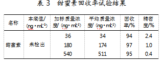 取炒货样品作为基质,在样品中添加低、中、高3个质量浓度水平的标准溶液,每个水平做双样,通过计算回收率和精密度来验证方法的准确度,结果见表3。从表3可以看出,在36~540 ng/mL加标范围内,甜蜜素回收率为94%~97%,精密度为0.4%~2.4%,表明该方法准确度高,可满足分析要求。