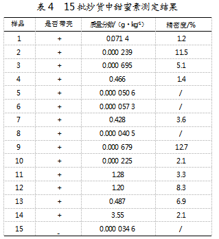使用上述验证的方法检测分析监督抽检的15份炒货样品,每个样品做双样,计算结果和精密度,结果见表4。