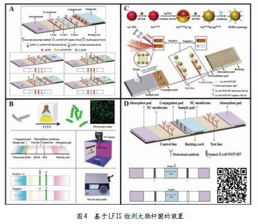 LFIS的应用原理是通过毛细作用使样品在试纸条上流动,利用抗原-抗体的特异性结合在检测线处形成可见条带,实现对大肠杆菌的快速检测。基于这一原理,相关学者开展了一系列创新性研究。2016年,Song等[24]采用胶体金免疫层析条(ICS)双抗夹心法(见图4A),将检测限进一步降至4 CFU/mL。