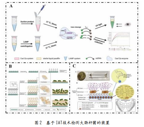 利用IAT实现大肠杆菌检测的国家食品相关标准包括SN/T 3567.3-2015和SN/T 2754.2-2011。IAT通过特定的酶和引物设计,在恒定温度(60~65℃)下实现核酸的高效扩增。IAT种类很多,包括环介导等温扩增(LAMP)、滚环扩增(RCA)、交叉引物扩增(CPA)、重组酶介导的等温扩增(recombinaseaid amplification,RAA)、重组酶聚合酶扩增(recombinase polymerase amplification,RPA)等。Wang等[15]开发了基于实时荧光LAMP(RT-LAMP)和以钙黄绿素为指示剂的2种视觉LAMP试剂盒,性能优异,富集3 h后检测到接种至牛奶中的2.26 CFU/mL的E.coli O157:H7。近年来,等温扩增技术与其他技术(如CRISPR、微流控、纳米材料、电化学传感器等)结合也成为研究热点,灵敏度、特异性和便捷性显著。Wang等[16]将LAMP与CRISPR/Cas12a系统创新性结合,3 h就检测到了初始污染为7.4 CFU/mL的大肠杆菌(见图2A),有效避免了假阳性结果。为进一步提升传感器性能,Li等[17]在微流控通道安装原位捕获RCA(cRCA)适配体装置(见图2B),通过优化反应时间和圆形模板的初始浓度等条件,使装置在检测大肠杆菌方面表现出了优异性能。Jiang等[18]改良使用多聚适配体修饰微流控通道,使捕获的靶细胞增加3倍,同时将cRCA和sRCA集成于一个RCA检测系统(见图2C),相较使用单个荧光探针,检测信号显著增强250倍。在实际检测中,大肠杆菌进入可存活但不可培养(VBNC)状态,无法用金标准培养方法识别。Zhou等[19]为解决该问题开发了单叠氮化丙啶(PMA)的CPA测定法,专门设计了5种引物(2a/1s、2a、3a、4s和5a)用于识别rfbE、stx1和stx2 3个靶标。结果显示,该方法可有效识别VBNC状态的大肠杆菌O157:H7,有力推动对E.coli O157:H7的检测进展。