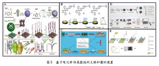 (Carbon Nanotubes,CNTs)、金属有机框架(MOFs)等。Wang等[38]合成吲哚-5-羧酸聚合为聚-5-羧基吲哚纳米材料(PI-5-CA),引进羧基化的单壁碳纳米管(C-SWCNTs),进一步提高PI-5-CA的比表面积和电导率,通过电流信号变化实现了30 min内对E.coli O157:H7的灵敏检测(见图6C)。Nguyen等[39]首次将MoS2纳米片应用于阻抗传感器,实现了对大肠杆菌DNA的超低检测限检测(见图6D)。Li等[40]使用抗体偶联QDs MnO2纳米复合材料与免疫磁性纳米微珠(MNBs)将细菌夹心捕获(见图6E),同时谷胱甘肽将MnO2还原为Mn2+,快速释放复合物中的QDs,使其荧光强度发生改变,实现检测。该免疫测定法可在2 h内同时定量检测1.5×101~1.5×106 CFU/mL的大肠杆菌,检测限为15CFU/mL。