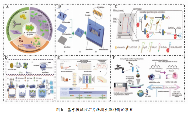 纳米粒子(AgNPs)增强表面增强拉曼光谱(SERS)信号强度,实现了优于其他传感器的低灵敏度,检测限为1.1 CFU/mL。为解决SERS重复性差的问题,Wang等[30]再在785 nm激发下,将NaYF4:Yb、Er SiO2 Au上转换微晶体复合材料(UC Au/Ag)嵌入了微流控芯片的基板(见图5B)。该传感器在检测大肠杆菌方面重复性优异。Sun等[31]开发了上游蛇形混合通道和下游船形微腔,以及微柱阵列组成的微流控装置(见图5C),通过催化发夹组装(CHA)和HRP-Au NPs催化化学发光实现了信号放大,仅需10μL样品就可在1.5 h完成检测工作。Zhu等[32]将噬菌体的功能化磁珠植入微流控装置中充当捕获探针,同时适配体连接共价有机框架(COF)材料作为检测探针,构建了“三明治”电化学和视觉荧光双信号传感器(见图5D)。该方法对大肠杆菌的检测范围为10~107 CFU/mL,检测限为4 CFU/mL。除上述高效策略,还存在其他一系列优异的方案。Quan等[33]创新性运用数字微流控技术,开发出一种基于时间序列图像分析的深度学习模型——TLENTNet(EfficientNet-Transformer网络)。该模型通过捕捉细菌生长过程中的时空特征,实现了对微流控芯片中大肠杆菌数量的精确计数(见图5E)。这一开创性工作标志着TLENTNet模型在细菌检测领域的首次成功应用。Rodoplu等[34]利用抗体结合的磁性颗粒捕获目标细菌,结合亚甲蓝存活试剂培养,通过微流控装置(μ瞳孔)实现视觉成像和比色信号监测(见图5F)。检测限(LOD)为2 CFU/100 mL(自来水样本)。该方法适用于资源有限地区的即时检测(POCT),资源消耗低、便携性高。