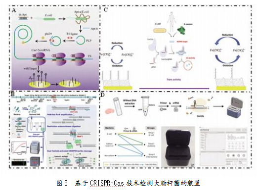 近年来,CRISPR/Cas12a技术与其他技术结合的策略在大肠杆菌检测方面显示出了优异性能。Andrea等[22]首次将CRISPR/Cas12a系统与电化学阻抗谱(EIS)测量结合,实现了对大肠杆菌和金黄色葡萄球菌的检测(见图3C),将LOD降至3 nM。Jiye等[23]利用增强型CRISPR/Cas系统、便携式荧光检测器共同搭建起一个检测大肠杆菌、大肠菌群和总细菌的即时护理平台(见图3D)。将ybbW基因用于大肠杆菌特异性检测,最终实现10-1个/μL(1个细胞/反应)的检测灵敏度和高特异性。