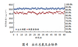 检测期间,综合调节池内废水的总氮质量浓度256.78~363.63 mg/L,均值为314.29 mg/L;MBBR生化反应池出水的总氮质量浓度50.24~47.63 mg/L,均值为48.82 mg/L。氨氮去除率为80.98%~86.57%,平均去除率达84.05%。系统出水总氮质量浓度及去除率如图4所示。