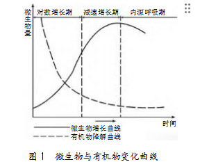 在太湖清淤固化土与蓝藻藻泥处理过程中,养护条件关系微生物活性与降解效率,需要严格监测养护结果,确保最大程度激发微生物潜力。微生物生长分为不同阶段,如图1所示。微生物增长曲线(实线)表明,随着时间推移微生物数量呈指数增长,后因营养物质消耗开始减少,进入内源呼吸阶段,逐渐由外源营养驱动转向内源物质消耗。