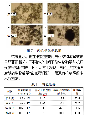 数据显示,随着养护时间延长,微生物数量增加,促进了污染物降解,同时固化土抗压强度显著提高,尤其在第14天和第21天微生物活性达到最佳,促使藻泥的有机物降解率显著提高且含水率逐渐下降,固化效果得到加强[5]。