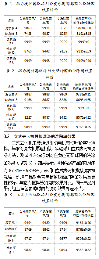 本文利用磁力搅拌器和立式去污机模拟洗衣机洗涤过程,以大肠杆菌和金黄色葡萄球菌为试验菌,建立评估洗涤剂洗除菌效果的方法,并验证其有效性和适用性,以期为制定标准化测试方法提供科学依据,弥补洗涤产品洗除菌效果评价方法的行业空白。