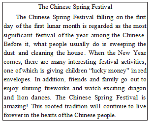 结合本单元的话题“节日与庆典”,教师延续了上一课时Reading and Thinking的课后任务:学校将举办关于中国传统节日的征文比赛,你想参加,请写一篇关于中国传统节日的文章,内容包括节日的时间、活动或评价等。因此,在课堂的导入部分,教师通过问题、图片的展示,激发学生的学习兴趣,让学生了解中国有很多传统的节日,并展示了一篇关于Chinese Spring Festival的征文。教师通过设置一些能激发学生思维的问题,引导学生关注问题的答案,从而把目标语法的学习融入技能训练之中。征文的内容如下: