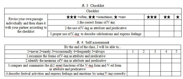 在完成以上的教学活动后,教师引导学生从形式、意义、使用这三方面回顾V-ing形式作定语和表语这一目标语法,并对所学的知识加以总结和概括。最后,教师给出自评表(Self-assessment)(见表4),引导学生对自己的学习进行监控、反思、调整和评价,以培养学生的自主学习能力。