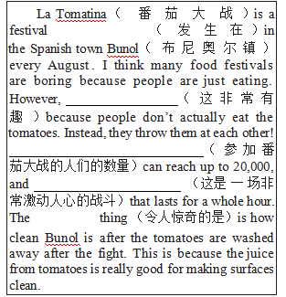 在第二个教学活动中,教师再一次利用多模态的手段,给学生观看西班牙的传统节日—La Tomatina(番茄大战)的小片段,要求学生用所学的V-ing形式作定语和表语完成关于La Tomatina的文章。