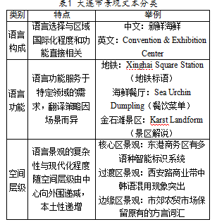 根据语言特点,笔者将大连市景观文本分为三类:语言构成、语言功能和空间层级,主要内容如表1所示。