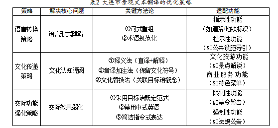 译者在进行汉英公示语翻译时,应当了解公示语在实际应用中的指示性、提示性、限制性和强制性四种突出功能(吕和发,2004:38)。本文从这四种应用功能切入,采取语言转换策略、文化传递策略和交际功能强化策略三种方式,为大连市的景观文本翻译提出优化方法,主要内容如表2所示。