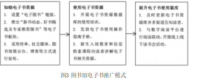 图书馆采购电子书资源后,不能让电子书变为“电子僵尸”,要引导读者知晓、使用电子书,提高读者利用图书馆电子书的频次和黏度,发挥图书馆电子书的服务效能,电子书推广模式如图3所示。