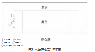 俗话说“好花还需绿叶衬”,伴奏是τ戏的重要组成部分。随着时代的发展,τ戏在音乐伴奏上也在进行改革尝试。笔者通过与旺艺τ戏团团长丘仕钦先生的访谈,绘制出了如图5所示的传统τ戏舞台平面图。从图5可知,传统τ戏在表演时伴有笛子、小号、扬琴、二胡、鼓、镲、电子琴等乐器的现场伴奏,而通过陆川县文化馆陈丽萍书记的访谈笔者得知,现代τ戏充分运用了现代技术进行背景音乐创作,其中融合了许多现代流行元素,如将电子鼓声、提琴声等元素制作成音频融入伴奏中进行演绎。