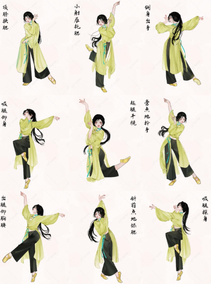 从动作表现上看,身韵训练重视“以腰为轴”,采用“元素—短句—组合”的递进式训练模式,帮助舞者形成规范的动作记忆体系。“柳腰”“水袖”等舞姿的练习,可以帮助舞者掌握“延展与收敛”技巧的对比运用,使舞者拥有更加具有张力的形体风貌。
