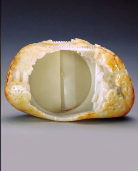 «桐荫仕女玉山»是清乾隆年间一位吴姓宫廷玉工借鉴一幅宫廷油画«桐荫仕女图»中的意象,巧妙运用“俏色雕琢”工艺制作的一个玉山子。玉工将本是充满瑕疵与裂痕的玉废料进行重新规划:橘黄色的皮子刻画成梧桐、寿石与覆瓦,破裂的门洞打造成半开半掩的院门,两边布置两个仕女,正相互探望,一束光从门外照进院内,使得这块玉山子充满了诗情画意。