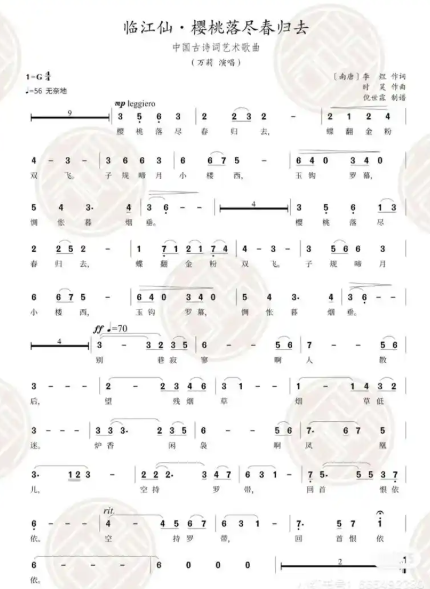 1982年,作曲家黎英海以唐代诗歌«春晓»«枫桥夜泊»«登鹳雀楼»为文本,谱作三首古诗词艺术歌曲。其中«枫桥夜泊»融合七声雅乐调式与传统六声调式,钢琴伴奏仿拟古琴音色技法,塑造“钟声”“水声”意象,并将古诗词吟诵风格渗透旋律,完美传递诗歌意境,成为当代中国古诗词艺术歌曲典范之作。