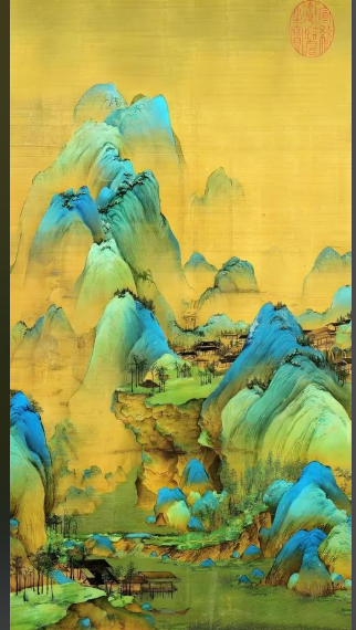 «千里江山图»是北宋画家王希孟创作的青绿山水画,运用全景式长卷(纵约51.1厘米、横约1191.51厘米),其构图宏大、色彩绚丽、技法精湛。在画卷中,有民舍人居,人物活动内容丰富,如幽居、旅行、游玩、捕鱼等。这幅作品继承并发扬了唐代青绿山水画的艺术创作技法,创作者用笔精细妙到毫巅,特别注重在青色、绿色之间寻求各种变化,是古意与创新兼顾、实景与想象交融的绘画作品,代表了我国古代青绿山水画的巅峰成就。