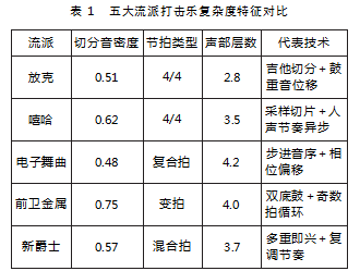 1990—2020年,不同流行音乐流派的打击乐节奏复杂化特征呈现出明显的差异。如表1所示,放克音乐的切分音密度为0.51,节拍类型主要为4/4拍,声部层数为2.8,其代表技术为“吉他切分+鼓重音位移”。这种节奏特征使得放克音乐具有强烈的动感与节奏弹性。嘻哈音乐的切分音密度为0.62,节拍类型同样为4/4拍,但声部层数达到3.5,其代表技术为“采样切片+人声节奏异步”。通过采样技术,嘻哈音乐可以将不同的节奏元素进行切片重组,创造出独特的节奏效果。电子舞曲的切分音密度为0.48,节拍类型为复合拍,声部层数为4.2,其代表技术为“步进音序+相位偏移”。电子舞曲通过硬件音序器实现多声部的节奏层叠,创造出丰富的节奏层次与动态变化。前卫金属的切分音密度最高,达到0.75,节拍类型为变拍,声部层数为4.0,其代表技术为“双底鼓+奇数拍循环”。这种节奏特征使得前卫金属具有强烈的节奏冲击力与复杂性。新爵士的切分音密度为0.57,节拍类型为混合拍,声部层数为3.7,其代表技术为“多重即兴+复调节奏”。新爵士通过多重即兴演奏,创造出丰富的节奏变化与动态效果。通过这种跨流派的节奏特征比较,可以清晰地看到不同流派在节奏复杂化方面的具体表现与技术应用,为研究节奏复杂化的发展趋势提供了重要参考。