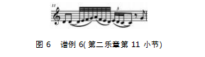 在本曲中,作者运用了大量的连音技巧,连音奏法作为一种柔和的吹奏,最能展现独奏乐器音乐柔和优美的特点(图6)。演奏者在吹连音时,首先要适当放松,提升嘴唇动作的灵活度,加强舌头对每个音符气息变化和节奏的准确控制,气息流必须快速,这样才能确保演奏的准确性。