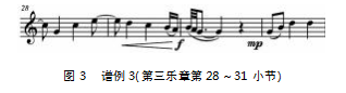 第三乐章为快板,3/4拍,舞曲的风格轻快活跃,伴奏部分简洁灵巧,在节奏中能感受到贵族的气息,庄重而不失典雅,体现了乐曲的古典主义风格。主题部分采用连续大切分的节奏型(图3),它不仅会要求乐器演奏者在即兴演奏一首歌曲时要有一定程度的艺术灵性,还要和其他艺术在色彩对比上显现出鲜明的艺术元素音符的配置。
