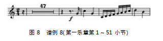 在第一乐章中第一个音是十六分音符带有forte(强)进入的,每个音在吹奏时的平均值都要相同,需要用快速的气流配合嘴唇的肌肉来撑住往高音区吹奏的压力,气息的缺陷与嘴唇耐力的不足都会无法正确地演奏出动听的声音,要使用正确的呼吸方法。(图8)