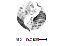 在现代图案创作中运用太极图元素,艺术家要充分把握和了解太极图所蕴含的内在魅力,以及给观者所传达出的审美观念,这种传达方式就是“意”的诠释,这种表达是将图案作品呈现出思维逻辑和观感意识。“意”并不是直接将外形复制到作品中,简单的复制只会影响图案的创新,创作需要对图形的重要形体进行重构,甚至进行深度的剖析。艺术家将太极图作为创作语言进行表达的时候,可提炼核心构成元素(如阴阳的平衡、圆的饱满)再进行创作,如图2所示(笔者创作),作品运用了乾卦和坤卦的“意”,在太极图意中乾卦指天,对应的是马;坤卦指地,对应的是牛,所以,用马和牛作为构图的主体动物元素,运用了现代人类对天空、宇宙探索,以及土地耕种的设备,赋予传统图案新的意念和设计思想。