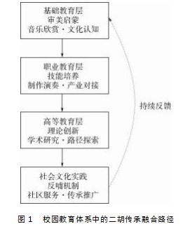校园教育体系为二胡传承提供了制度化与规模化的人才培养渠道,其融合路径需超越简单的课程植入,在基础教育、职业教育与高等教育三级体系中建构起差异化传承策略(图1)。基础教育阶段,侧重审美启蒙,将二胡音乐欣赏纳入艺术课程模块,通过经典曲目聆听、乐器构造认知与简易演奏体验构建初步文化认知。职业教育阶段,强化技能培养。在艺术类中职院校开设二胡制作与演奏专业方向,对接文化产业人才需求,解决传承链条中的技术工人断层问题。高等教育阶段,注重理论创新,鼓励音乐学、非遗学交叉研究,探索二胡艺术的当代转化路径。融合创新的关键在于打通校内外资源,建立“非遗传承人进校园+师生进社区实践”的双向流动机制,使学校成为连接专业传承与社会普及的中枢节点,在满足素质教育需求的同时为二胡艺术培育起具备现代教育背景的新生代传承主体。