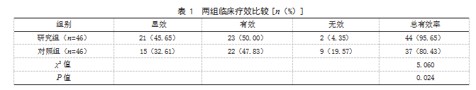 2.1两组临床疗效比较研究组治疗总有效率为95.65%(44/46),高于对照组的80.43%(37/46),差异有统计学意义(P<0.05)。见表1。