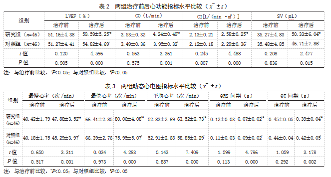 1.3观察指标(1)比较两组临床疗效。显效:胸闷、心悸、气喘等临床症状基本消失,日常生活自理能力恢复;有效:临床症状在活动后偶尔出现,日常生活基本自理;无效:临床症状稍有改善,但活动后加重,生活无法自理。总有效率=(显效+有效)例数/总例数×100%。(2)比较两组治疗前后心功能指标水平。采用心脏四维彩超检测并记录左心室射血分数(LVEF)、心排血量(CO)、每搏量(SV),并计算心脏指数(CI)。(3)比较两组治疗前后动态心电图指标水平。使用24 h动态心电图监测最快心率、最慢心率、平均心率、QRS间期、QT间期。(4)比较两组术后3个月主要心血管不良事件(MACE)发生率。