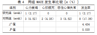 2.4两组MACE发生率比较术后3个月,研究组MACE发生率为2.17%(1/46),低于对照组的17.39%(8/46),差异有统计学意义(P<0.05)。见表4。