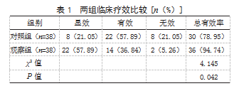 2.1两组临床疗效比较观察组治疗总有效率为94.74%(36/38),高于对照组的78.95%(30/38),差异有统计学意义(P<0.05)。见表1。
