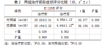 2.2两组治疗前后症状评分比较治疗前,两组R-INVR评分比较,差异无统计学意义(P>0.05);治疗后,两组R-INVR评分均低于治疗前,且观察组低于对照组,差异有统计学意义(P<0.05)。见表2。