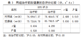 2.3两组治疗前后健康状态评分比较治疗前,两组KPS评分比较,差异无统计学意义(P>0.05);治疗后,两组KPS评分均高于治疗前,且观察组高于对照组,差异有统计学意义(P<0.05)。见表3。