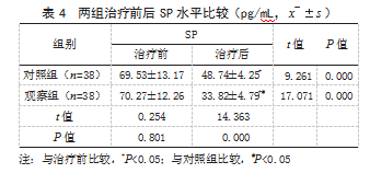 2.4两组治疗前后SP水平比较治疗前,两组SP水平比较,差异无统计学意义(P>0.05);治疗后,两组SP水平均低于治疗前,且观察组低于对照组,差异有统计学意义(P<0.05)。见表4。
