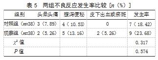 2.5两组不良反应发生率比较观察组不良反应发生率为23.68%,对照组不良反应发生率为18.42%。两组不良反应发生率比较,差异无统计学意义(P<0.05)。见表5。